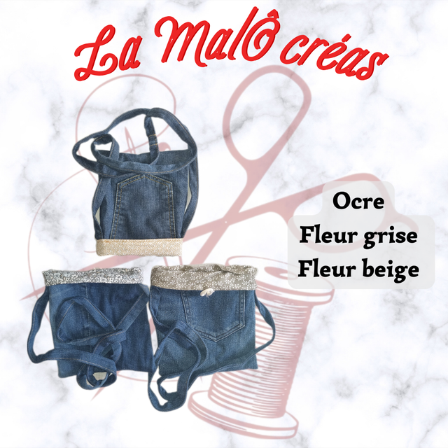 Matières: Jean recyclé, tissu coton, bouton et cordelette